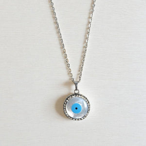 This minimalist necklace features a vivid blue evil eye set on a glossy white disc, framed by a crystal halo and suspended from a delicate silver-tone cable chain. Clean, modern, and easy to layer—perfect for tees, kurtas, and dresses alike.