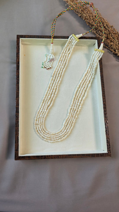 This handcrafted freshwater pearl mala is a timeless addition to your collection. Its natural luster and multi-strand depth make it a standout accessory — graceful, elegant, and effortlessly stylish.