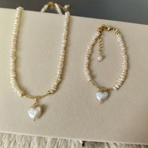 Freshwater Pearl Necklace & Bracelet Set with Heart Pendant – 18K Gold-Plated