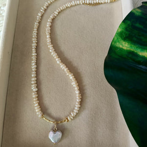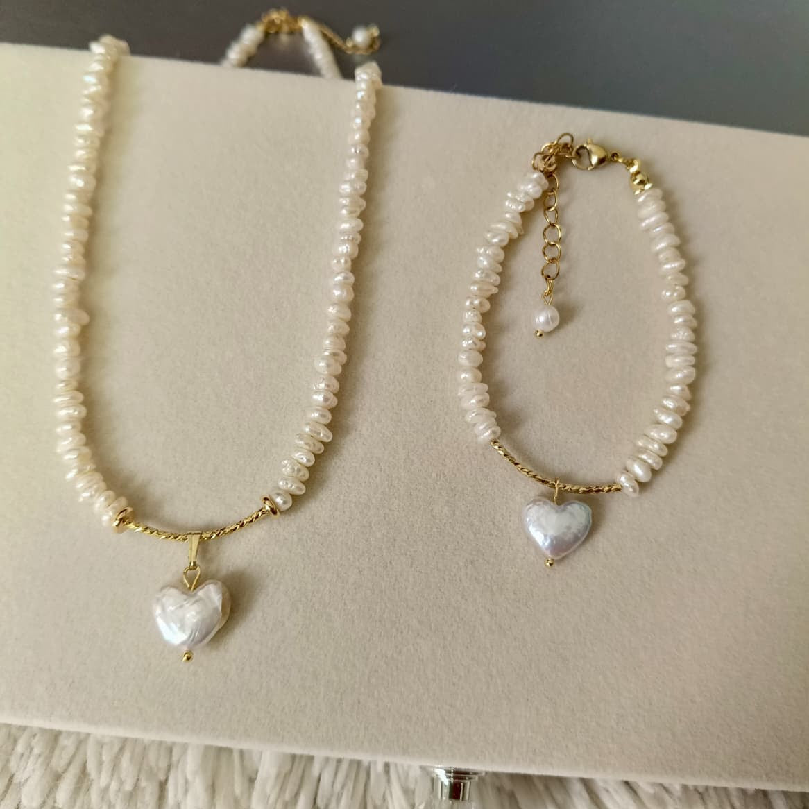 ✨ Each piece is handcrafted with genuine freshwater pearls, radiating a natural luster that complements both formal and casual outfits. The necklace and bracelet are finished with 18K gold-plated accents and adorned with a heart-shaped mother-of-pearl pendant, symbolizing love and sophistication.