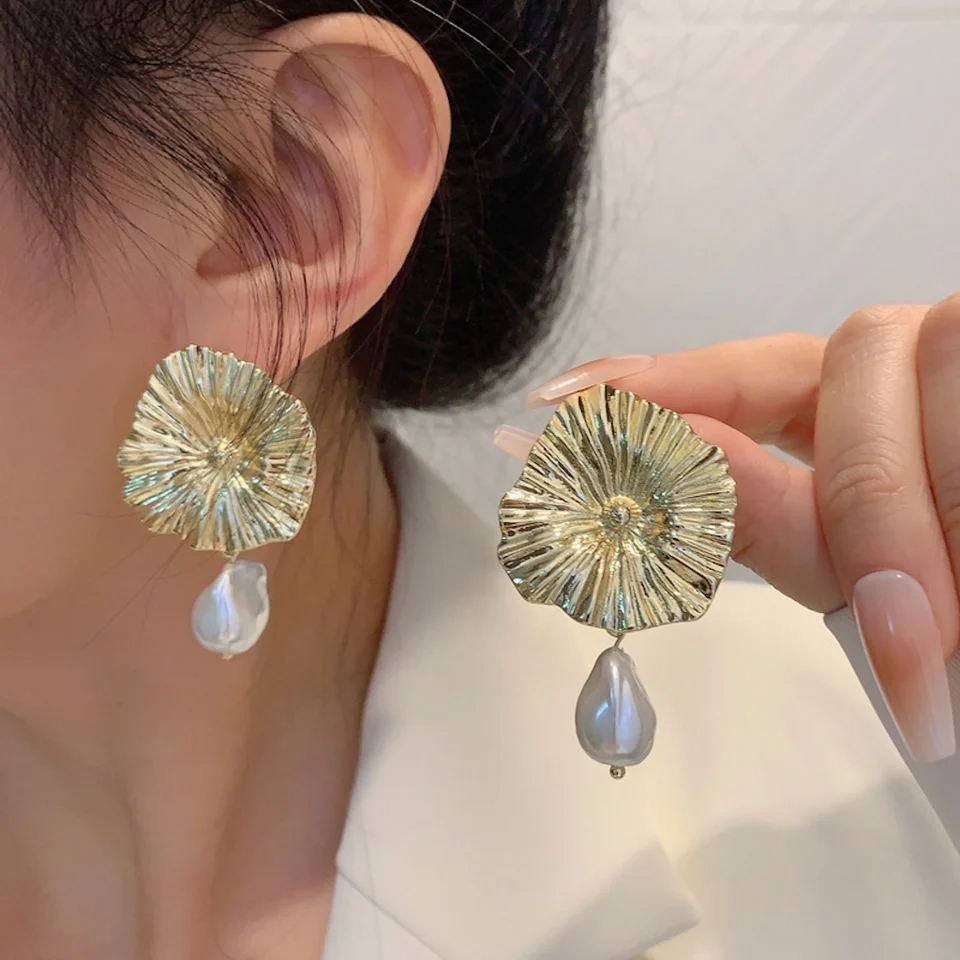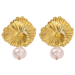 Home Gold Textured Floral Earrings with Imitation Pearls – Statement Earrings for Women